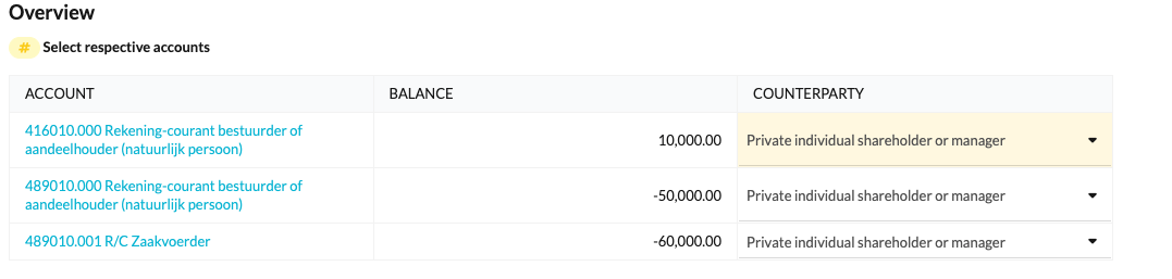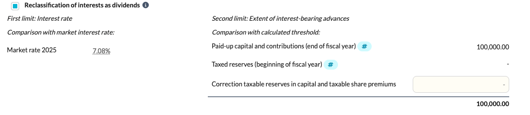 Smart Reclassification: based on the counterparty, the template automatically determines the tax treatment, whereby only the reclassification is calculated in the table when ‘natural person shareholder/company director’ is selected, and the excessive interest if ‘Related legal entity (loan before 17/06/2016)’ is selected. The other options will not trigger the reclassification.