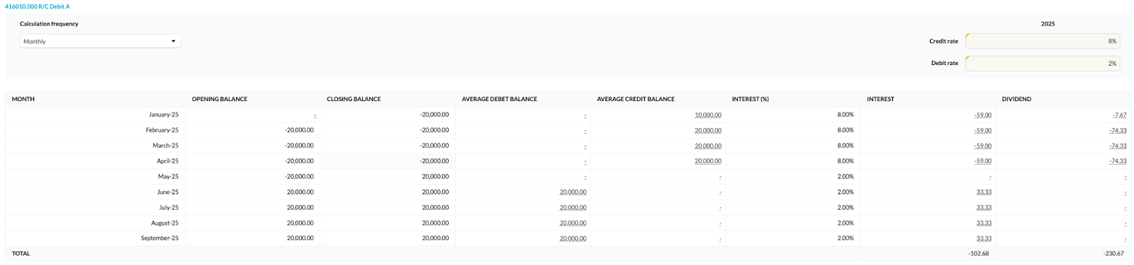 - If the interest calculation changes during the year (for example, from debit to credit), you do not need to manually transfer the amounts between accounts. Silverfin will automatically apply the correct percentage based on the positive or negative amount.