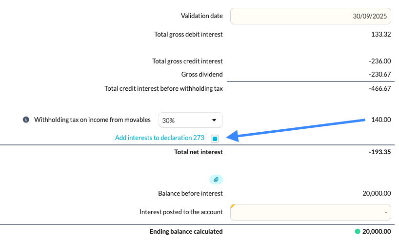 Finally, through the # icon next to "Total gross interest", you can link the relevant account to check that the booked amount corresponds to the entries on accounts 65 or 75. This ensures the total gross interest is processed correctly.