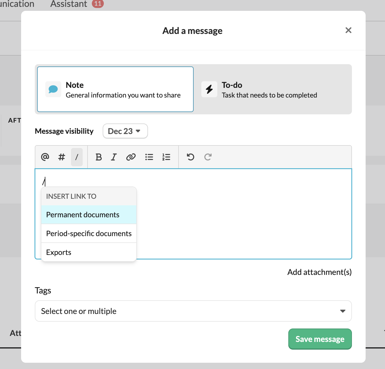 You can add direct links to existing content when creating Notes or To-dos in Silverfin. This update helps you reference the right information quickly and keep communication clear.
