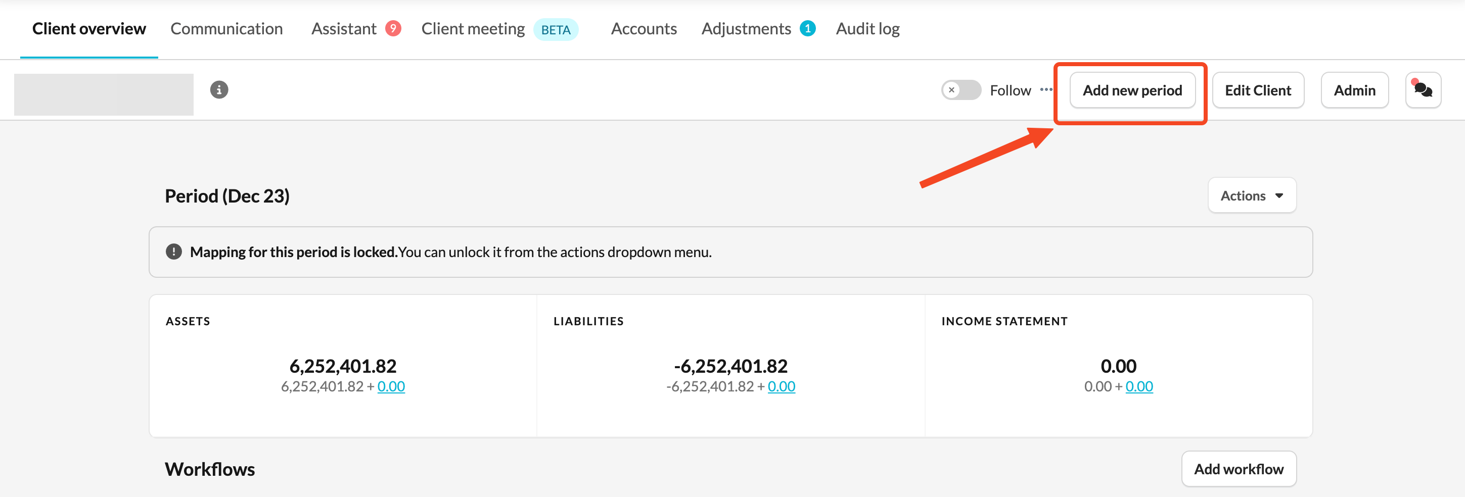 - New period: if your file already contains data, click ‘Add new period’ on the client overview page to add data for a new period.