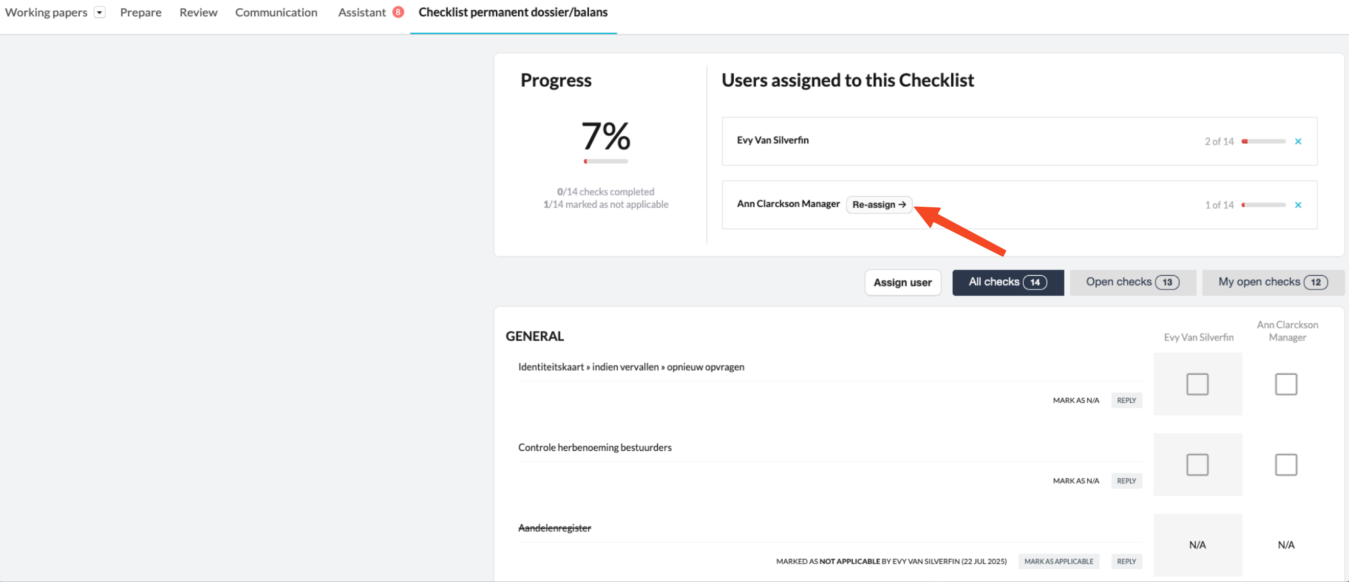 - Completed checks remain completed. For example, if 2 out of 4 checks were completed before reassignment, the new assignee will see the checklist at 50 percent progress, not 0 percent.