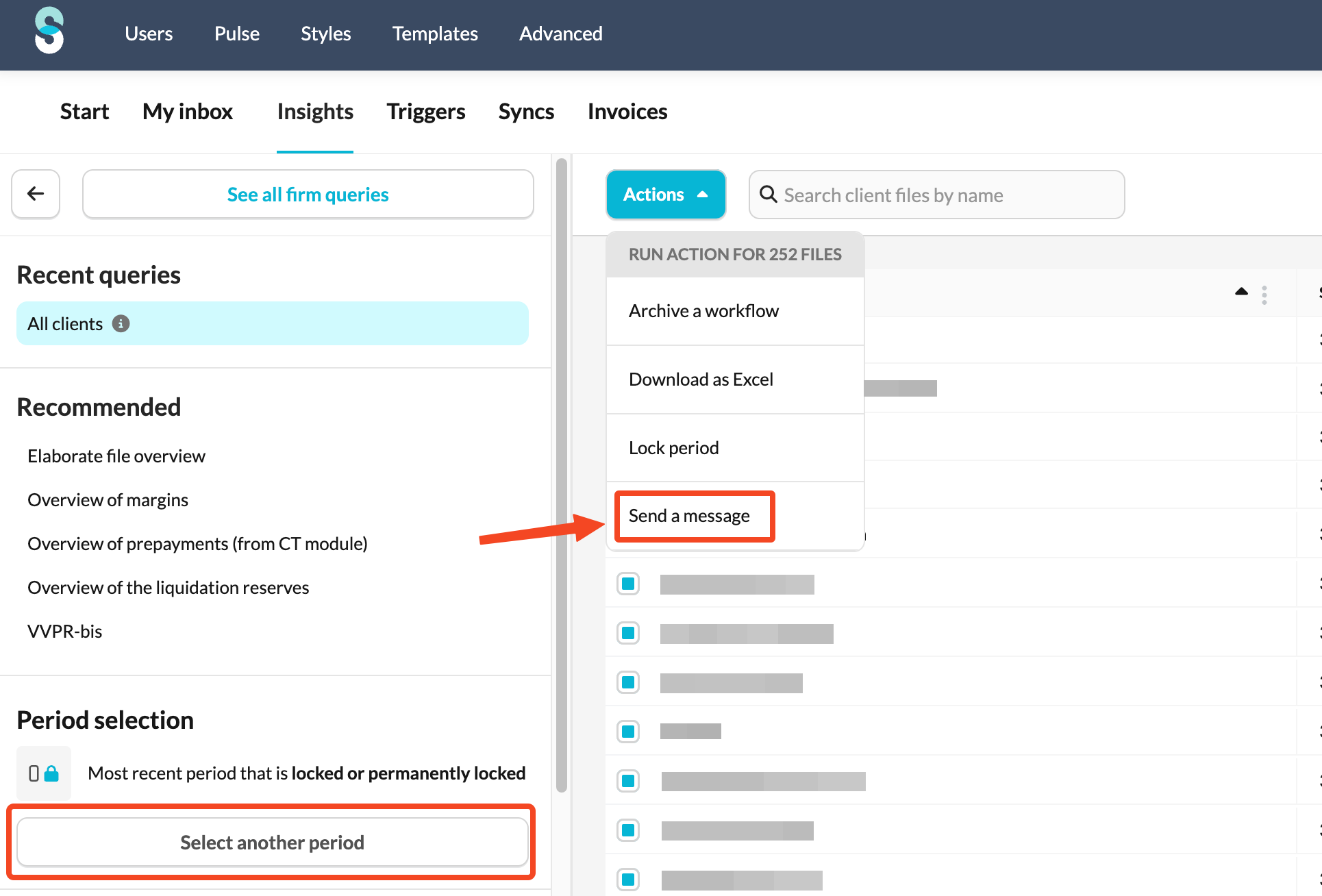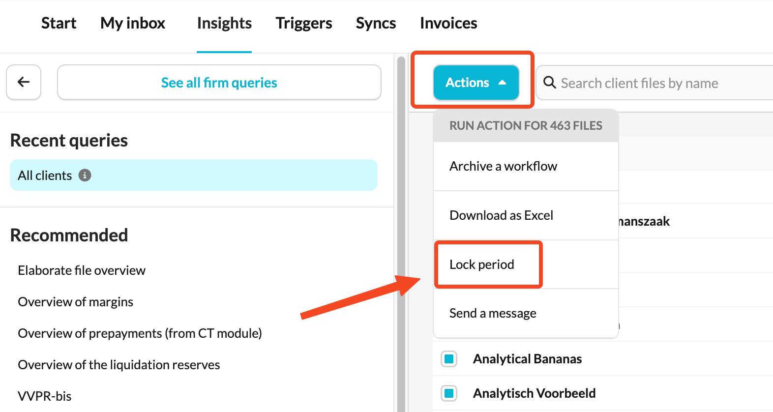 Admin users can lock periods for multiple client files directly from the Actions menu in Insights.