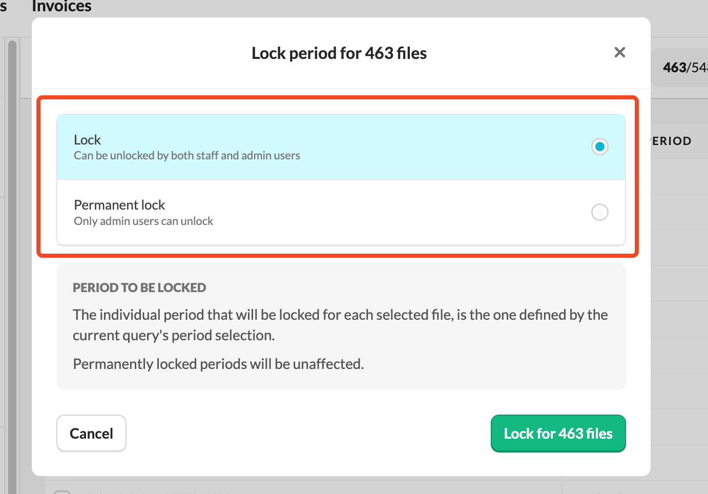 - Choose Lock period. Note: Action is available only if period is determined in period selection.