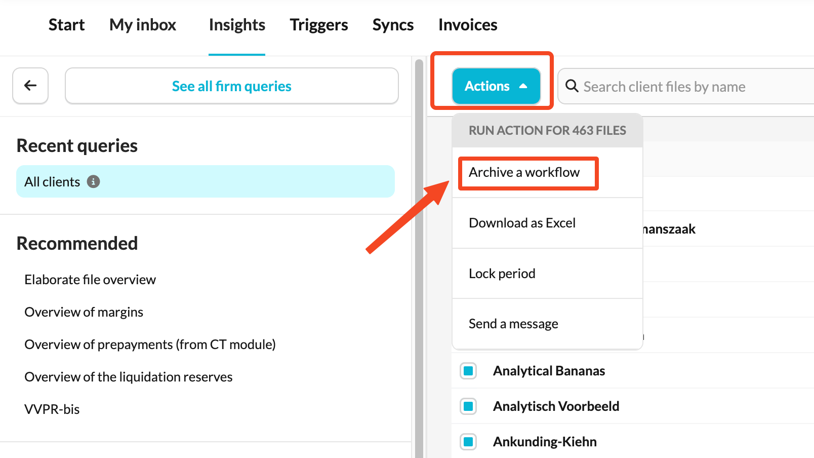 Admin users can archive workflows for multiple client files directly from the Actions menu in Insights.