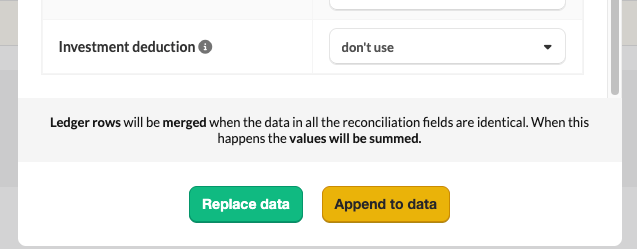 Ledger rows will be merged when the data in all the reconciliation fields are identical. When this happens the values will be summed.