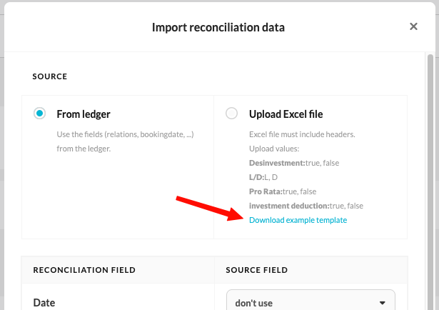 - After you have added the data to the Excel file, click on 'Upload Excel file' and select the relevant file. If the reconciliation field can find the same name in the Excel file (provided it contains the structure as in the sample template), Silverfin will automatically assign the source field.