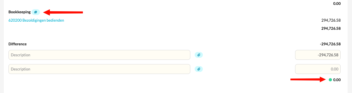 This reconciliation lists the employee payroll expenses paid by the company. The reconciliation allows you to link the associated accounts using '#'. Under the payroll certificate, you declare the employees' remuneration. There are three subdivisions: Gross wages, Contribution NOSS, and Other employee expenses. You can also add relevant documents to this reconciliation using the paperclip.