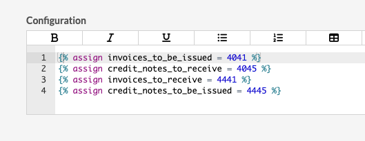 {% assign credit_notes_to_be_issued = "" %} - Replace the " " with the desired ranges. However, keep in mind that these variables only consider the first four digits of the account number, so a possible configuration could be:
