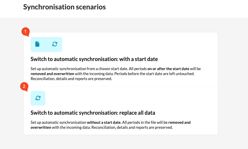 - Choose one of the provided synchronisation scenarios. If you choose the first scenario, you will be promoted to set up sync transfer date.