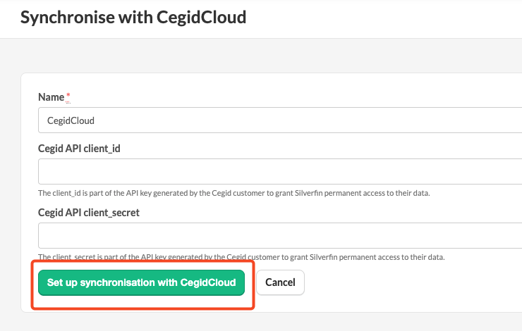- Fill in the relevant fields and click 'Set up synchronisation with CegidCloud'.