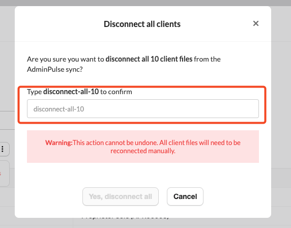 - Review the confirmation modal. It shows how many client files will be disconnected.