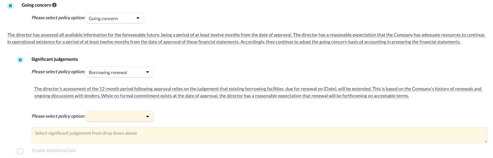 - Silverfin Impact: The Going Concern section of the accounting policies note has been redesigned to accommodate these mandatory requirements. New drop-down menus allow you to select the overall going concern status and choose from a list of significant judgements. Additional text boxes are also available for you to provide extra custom wording where specific detail is required.