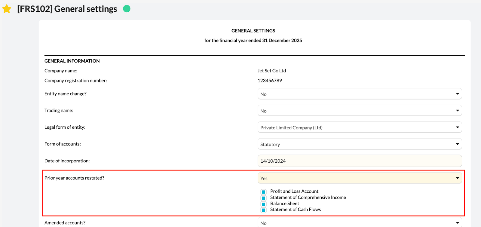 - The Full Retrospective method involves restating every figure in your accounts as if the new rules had always existed. To do this, you will need to navigate to the Accounts Workflow for the relevant period. From there, access the General Settings template and locate the toggle for Prior year accounts restated?. This then allows you to toggle which statements have been restated. See the screenshot below.