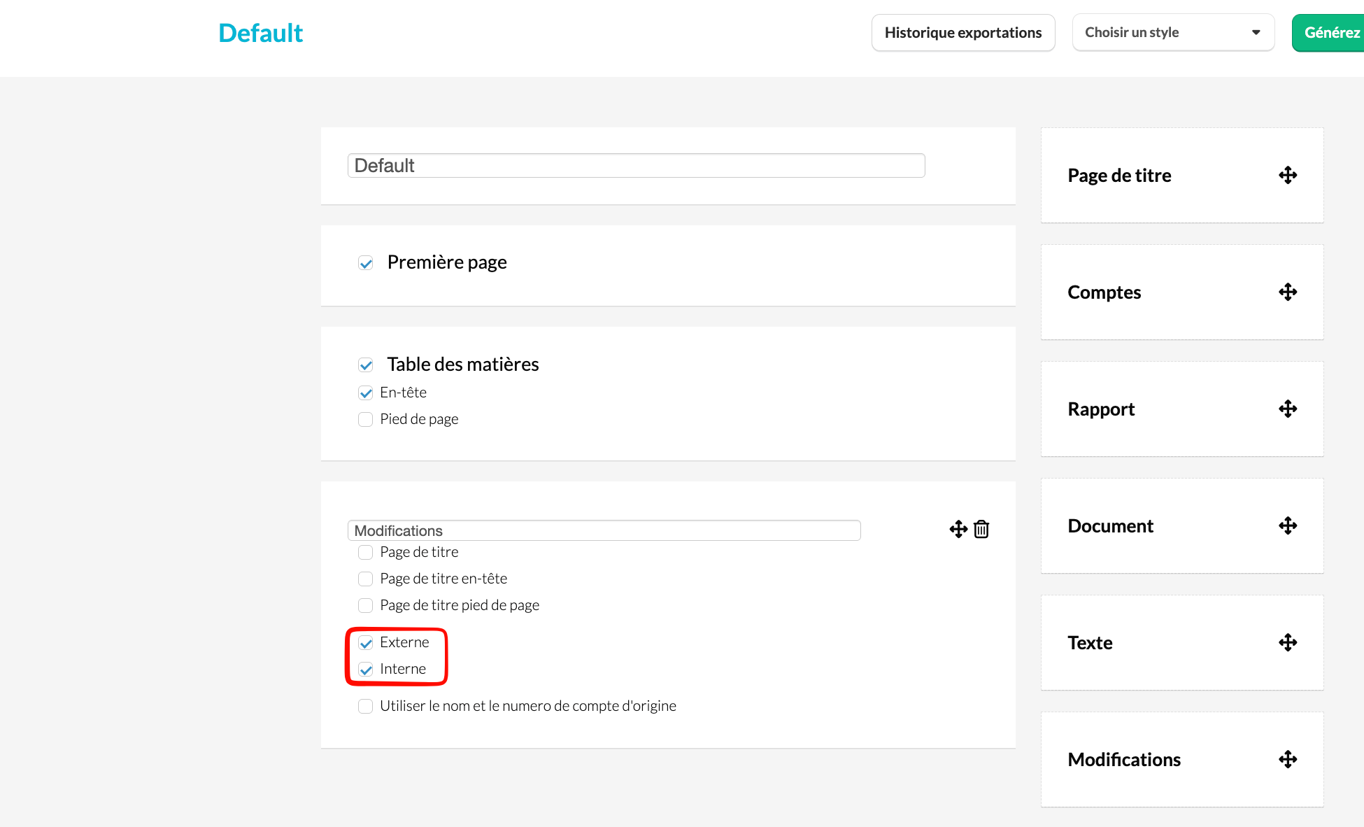 - Lors de l'exportation, vous pouvez choisir d'inclure uniquement les modifications internes, uniquement les externes, ou les deux.