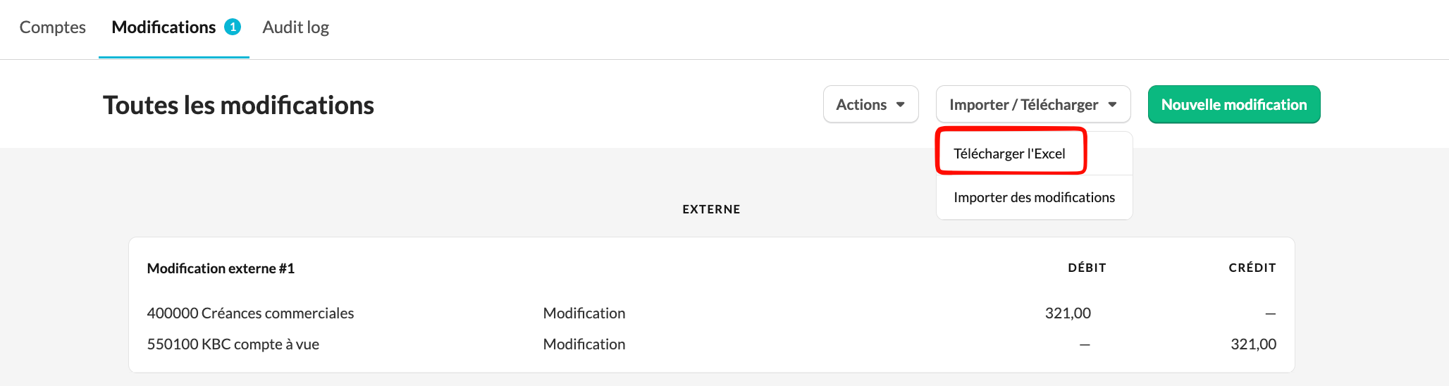 - Dans l'onglet Modifications du client, cliquez sur Télécharger/Téléverser → Télécharger l'Excel.