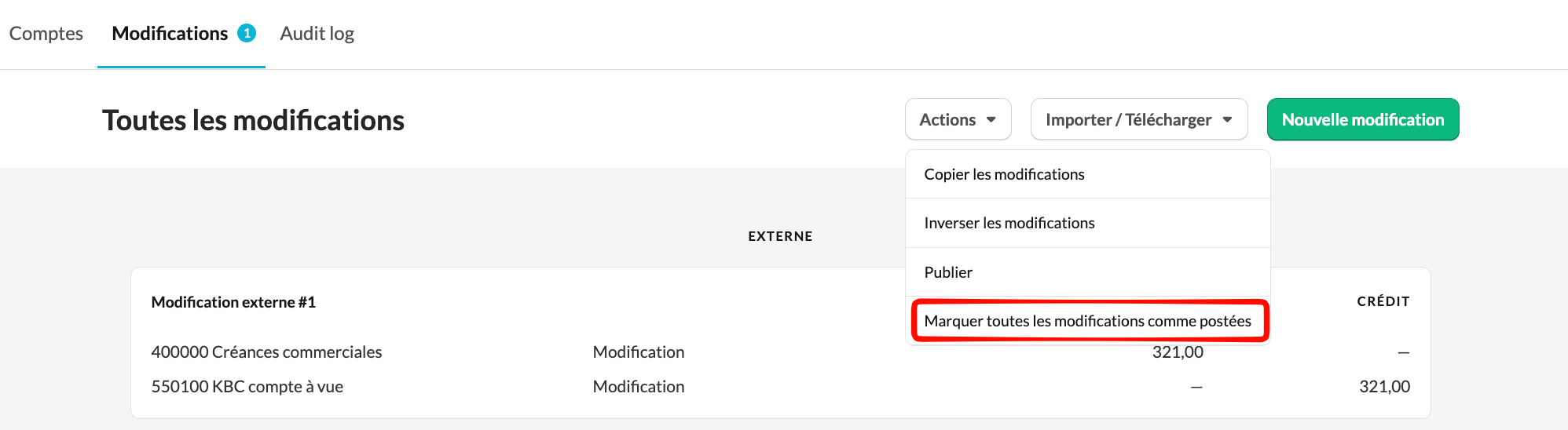 - De retour dans Silverfin, allez dans Modifications → Actions → Marquer toutes les modifications comme postées. Cela évite que les modifications ne soient dupliqués lors d'une resynchronisation des données.