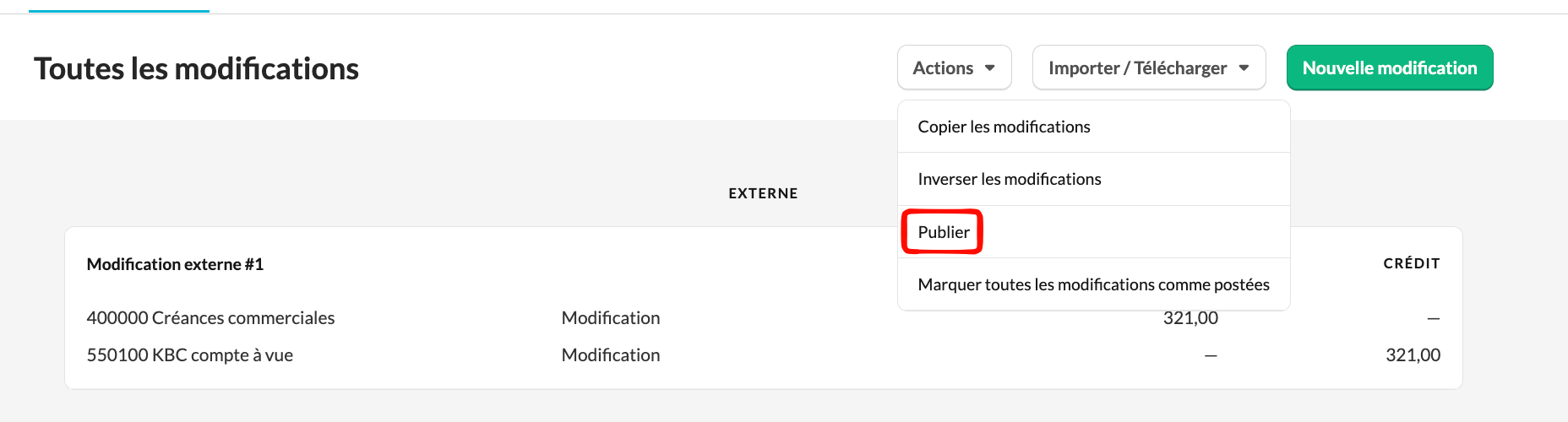 - Si une modification spécifique a déjà été traitée dans votre comptabilité, vous pouvez marquer uniquement cette entrée comme Publiée.