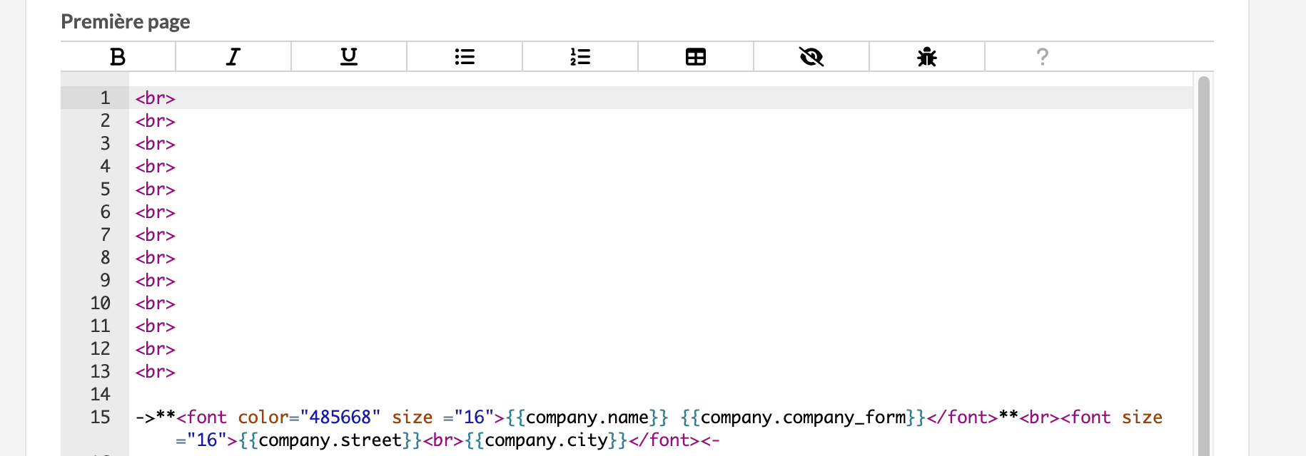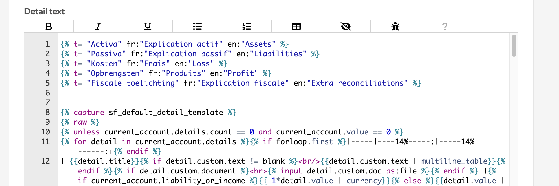 Lors de la création du réglage, vous devez ajouter le code Liquid à différents endroits. Ce code détermine la structure des comptes annuels et l’affichage des sections dans le PDF. Soyez prudent lors de l’édition de ce code. Si vous n’avez pas d’expérience avec les modèles Liquid, ne modifiez rien d’autre.