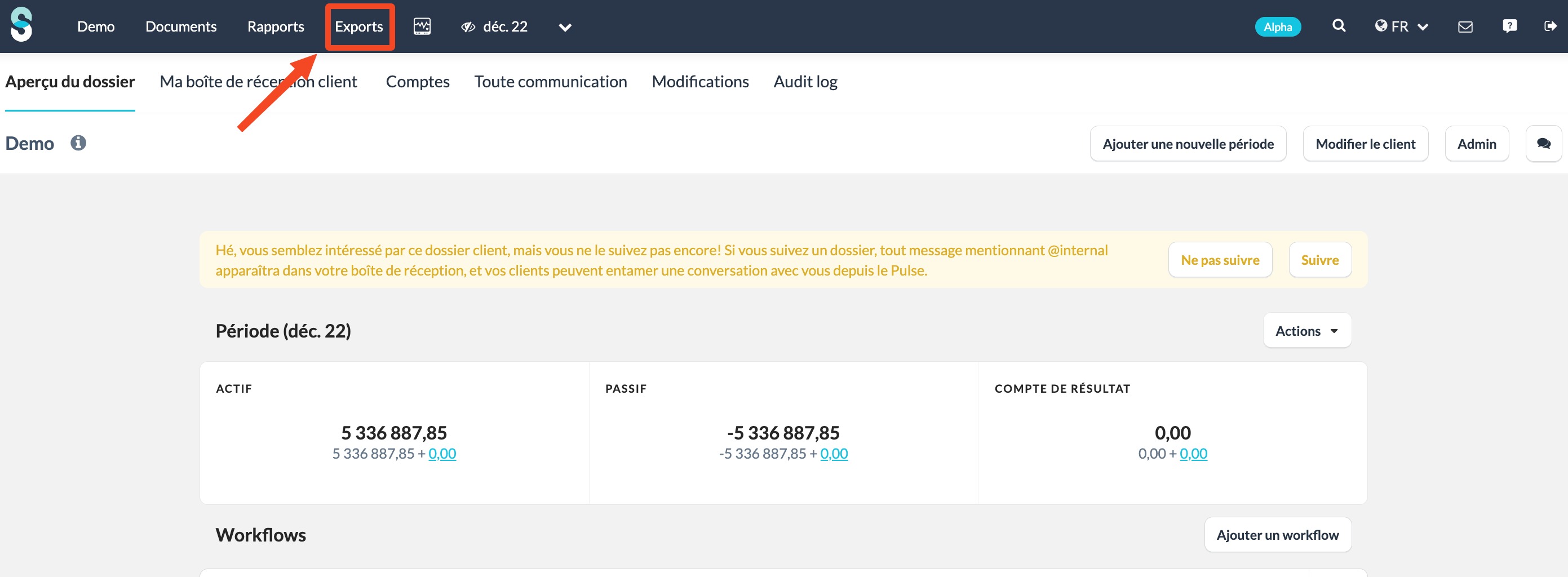 - Depuis la page Aperçu du client, sélectionnez Exports dans le panneau supérieur. Cela vous dirigera vers la section d'exportation.