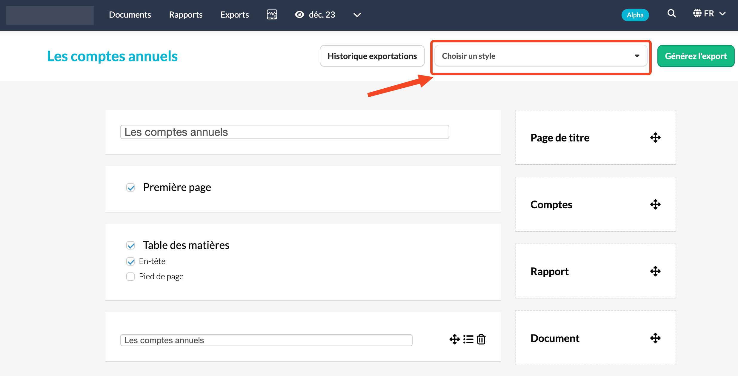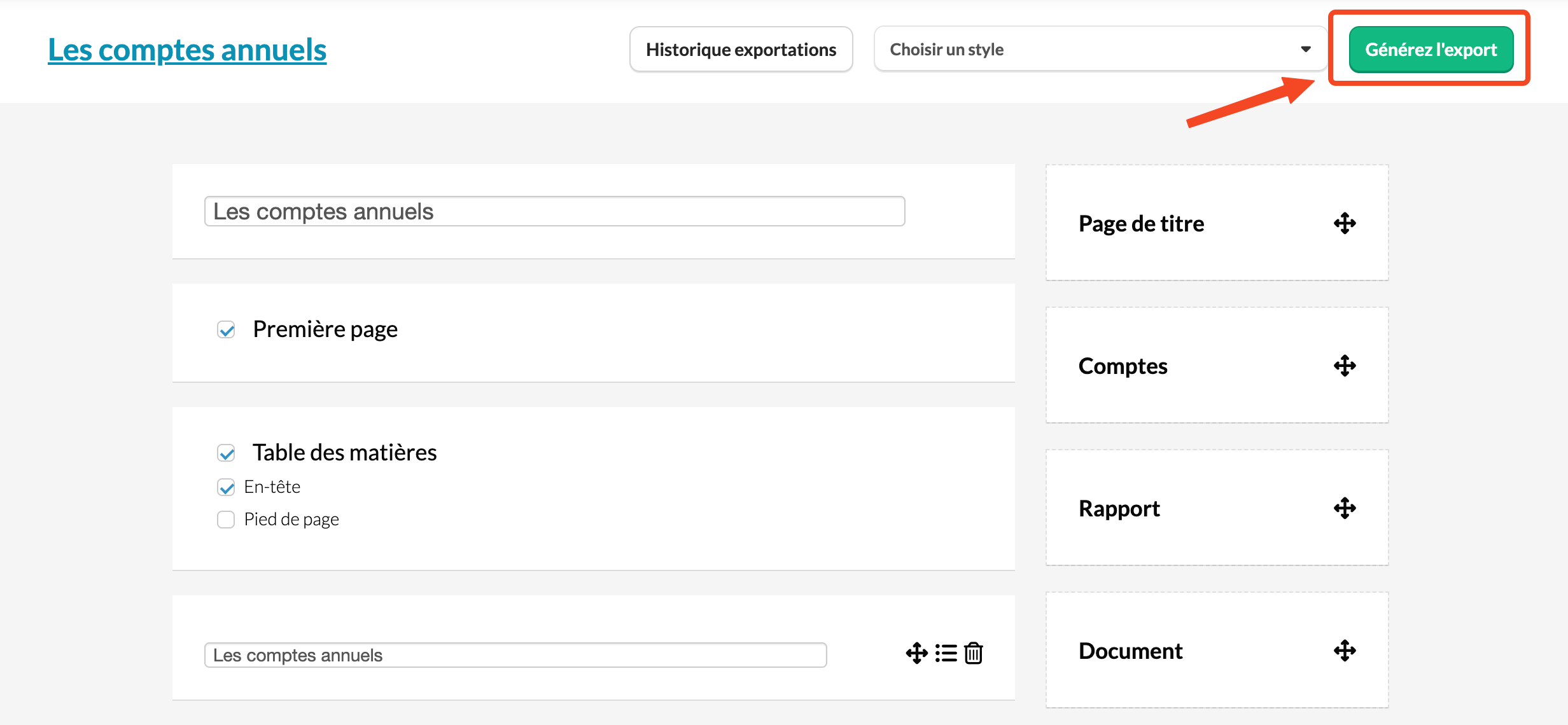 Cliquez sur le bouton Nouvelle exportation.- Choisissez un réglage de comptes annuels prédéfini dans le menu déroulant.