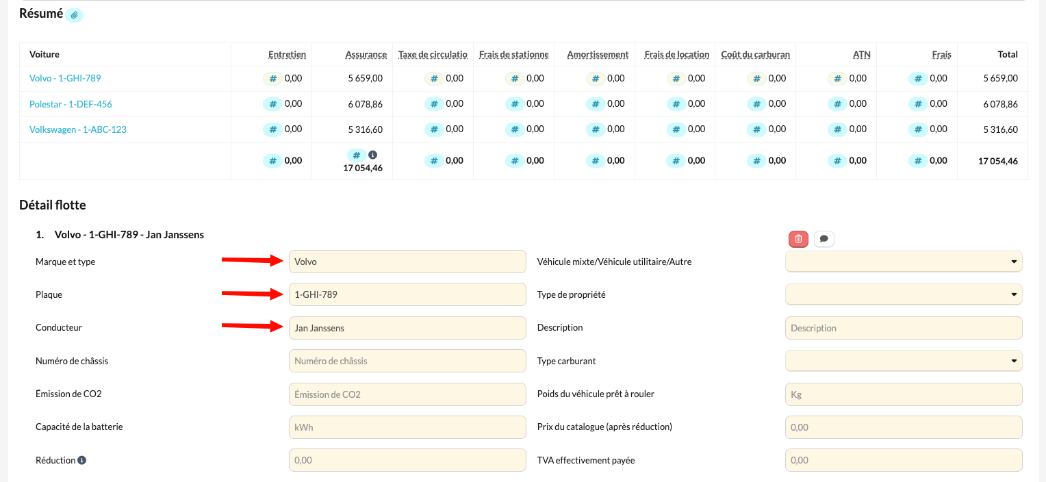 La première étape consiste à remplir les informations de la Flotte. Vous trouverez plus d'informations sur la flotte dans cet article. Pour utiliser le modèle de compte, vous devez saisir à la fois la plaque, le conducteur, ainsi que la marque et type dans la réconciliation "Flotte".