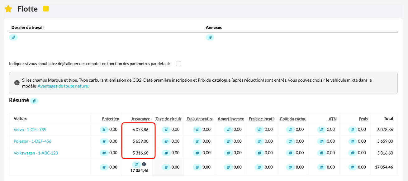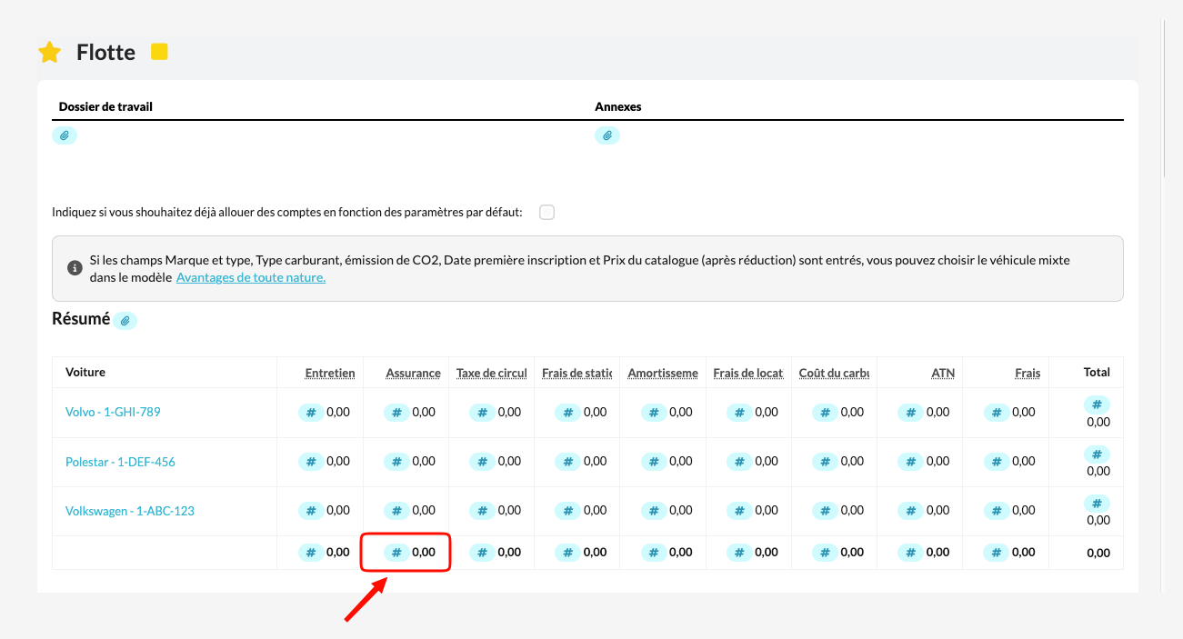 Lorsque vous enregistrez des coûts, tels que des "assurances", pour différents véhicules sur un seul compte de charges, sélectionnez ce compte de charges dans le tableau de la Flotte, dans la ligne totale de la colonne concernée.