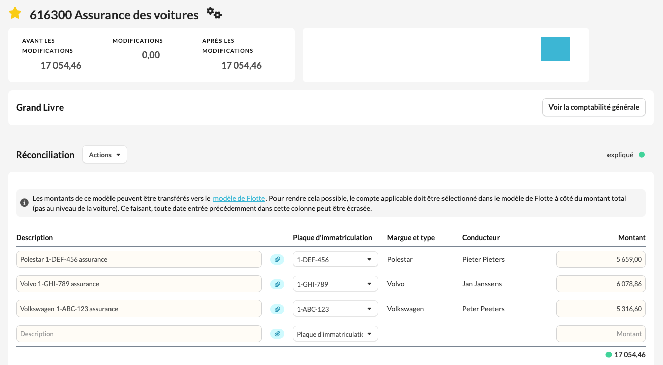 Avec le modèle de compte "Répartition des coûts de la flotte", vous pouvez facilement gérer les coûts du flotte. Ce modèle peut être lié aux 61 comptes et permet de répartir les coûts par véhicule en fonction de la plaque d'immatriculation, comme décrit dans la réconciliation "Flotte".