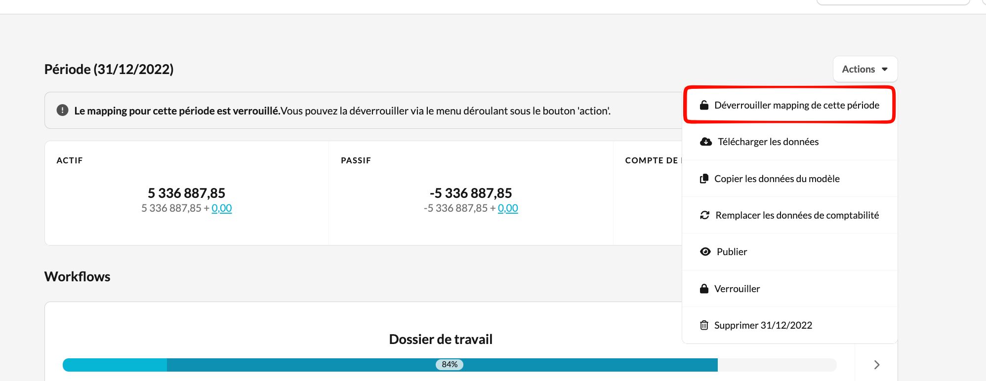Avertissement : Lors du déverrouillage du mapping, un avertissement apparaîtra pour s'assurer que vous comprenez les conséquences possibles. Le mapping sera alors mis à jour, et les comptes de la période sélectionnée peuvent changer en fonction du nouveau mapping. Il est recommandé de vérifier vos flux de travail (workflows) et d'apporter les ajustements nécessaires pour garantir l'exactitude des données.
