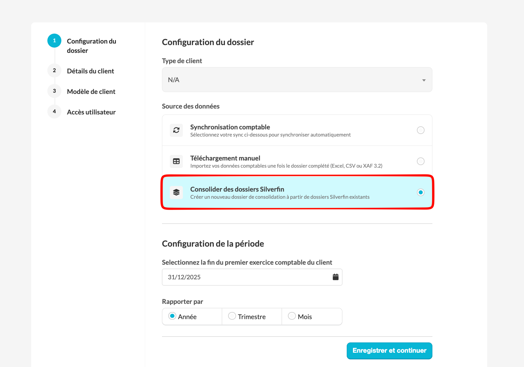 - Dans la section « Source de données », choisissez l'option « Consolider des dossiers Silverfin ».