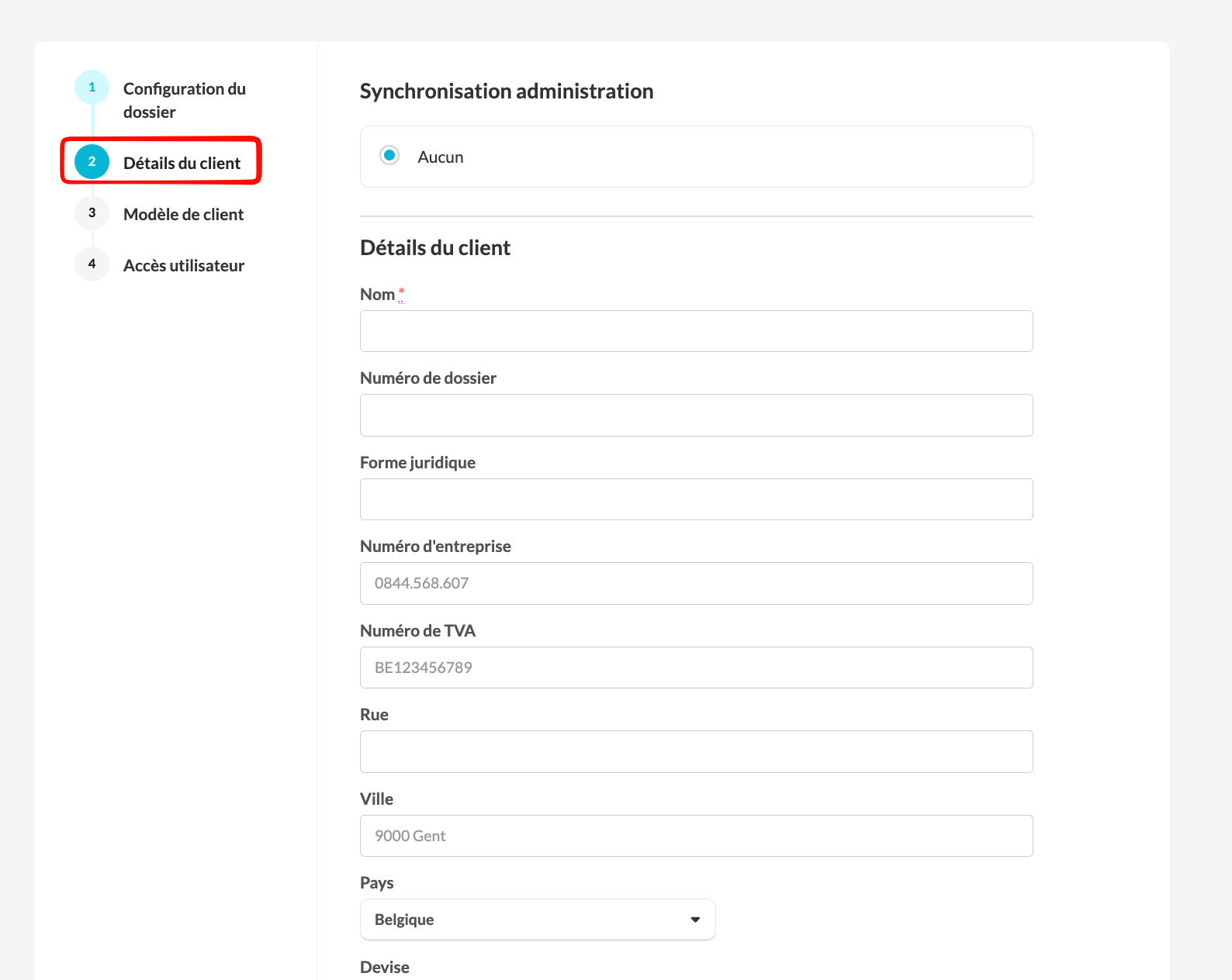 Détails du client: Saisissez les informations de base de votre entreprise, telles que le nom, l'adresse, la forme juridique, la devise et le logo de votre cabinet. À ce stade, seul le nom de l'entreprise est obligatoire. Les informations manquantes pourront être ajoutées ultérieurement