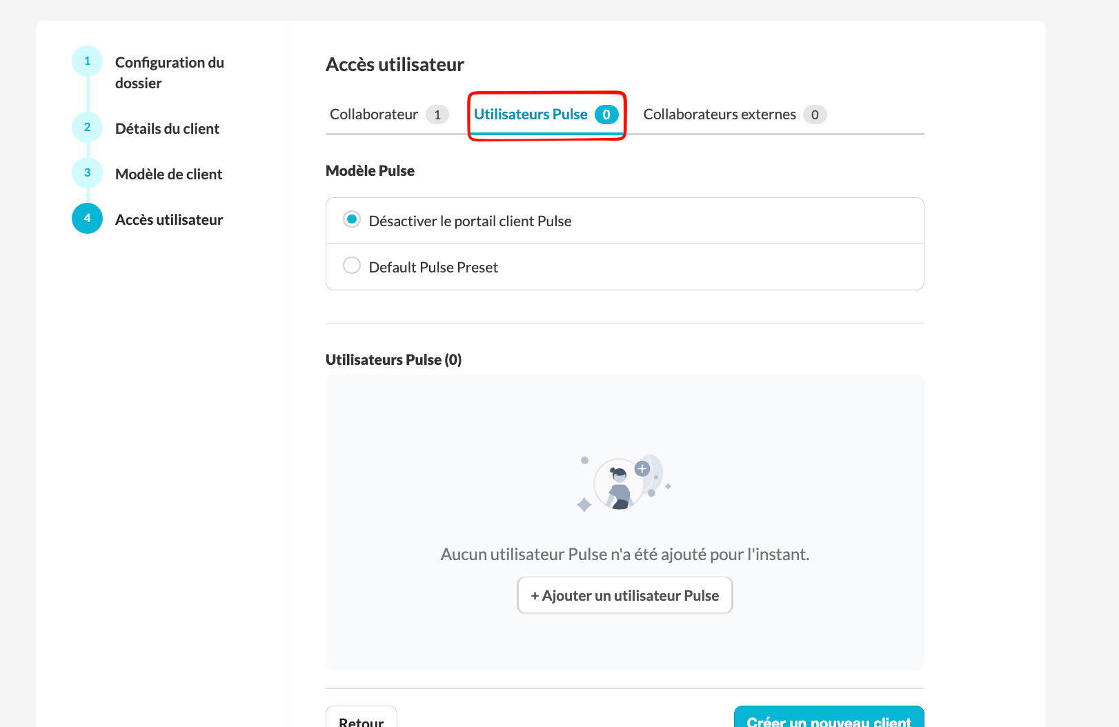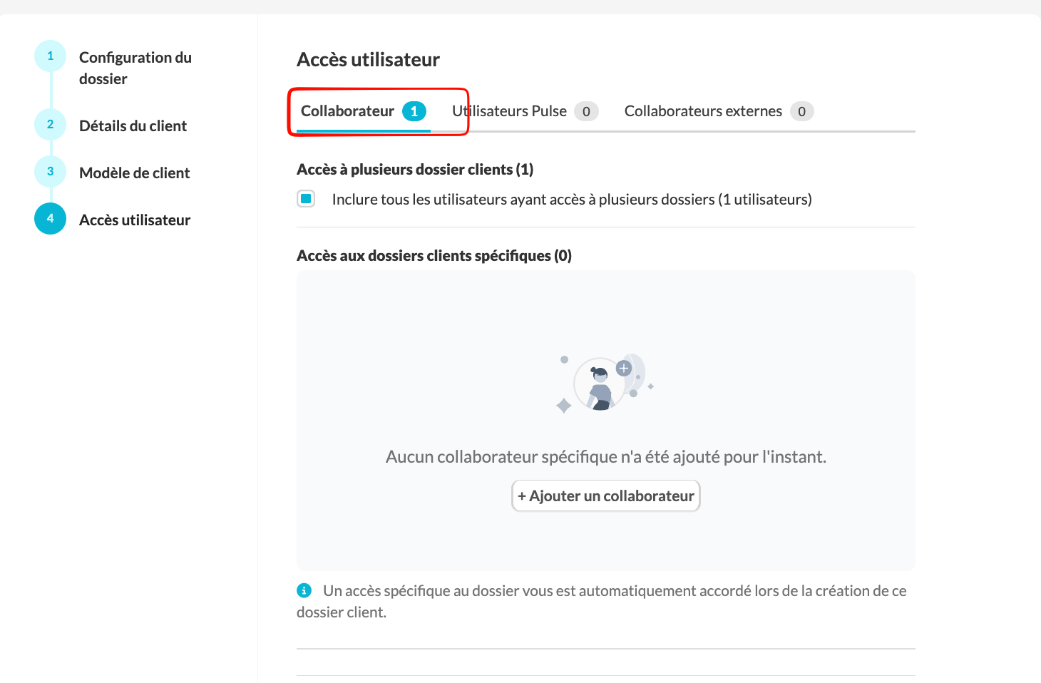 - Les utilisateurs internes ayant reçu l'autorisation de créer des clients dans leurs paramètres utilisateur au niveau du cabinet.