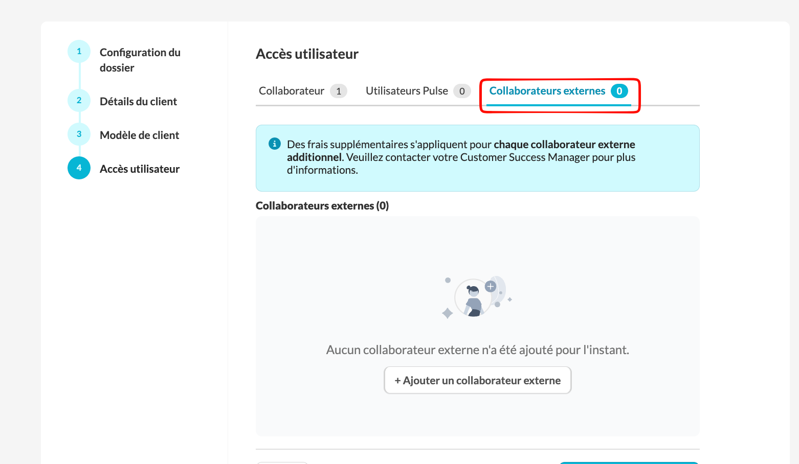 - Collaborateurs externes : ajoutez des parties externes au dossier. Des frais supplémentaires sont facturés pour chaque collaborateur externe additionnel. Contactez votre Customer Success Manager pour plus d'informations.