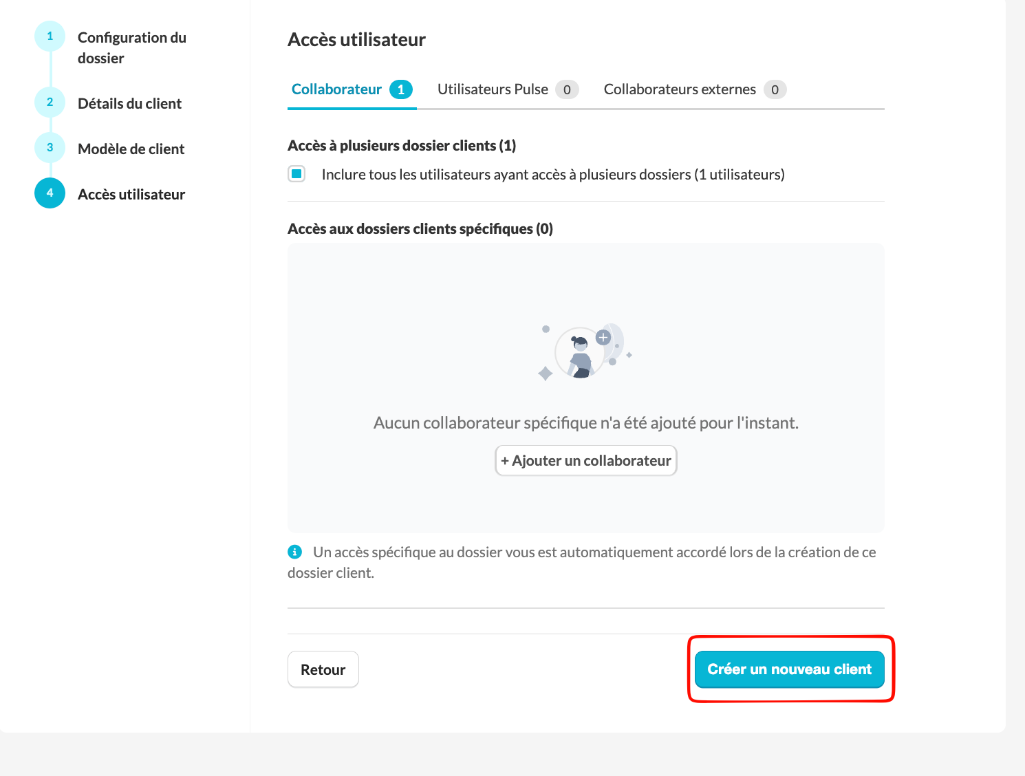 Une fois toutes les étapes terminées, cliquez sur le bouton « Créer un nouveau client » pour finaliser le processus.