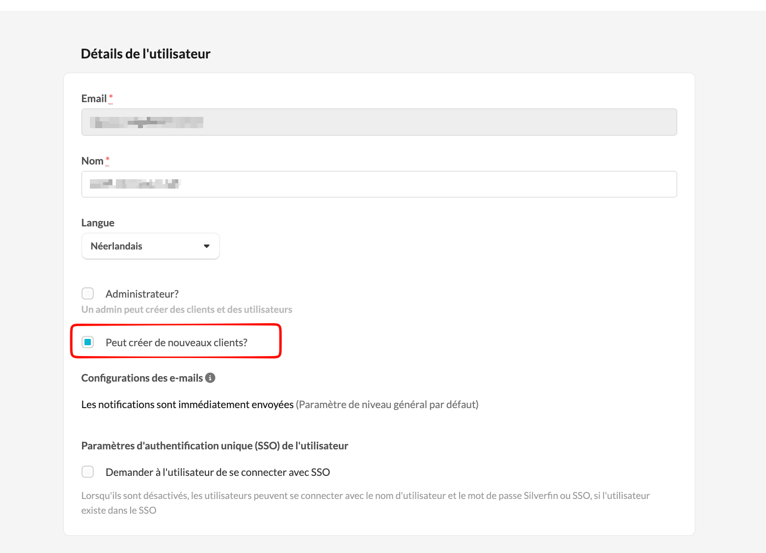Vous ne voyez pas l'option « Peut créer de nouveaux clients? » ? Contactez votre Customer Success Manager.