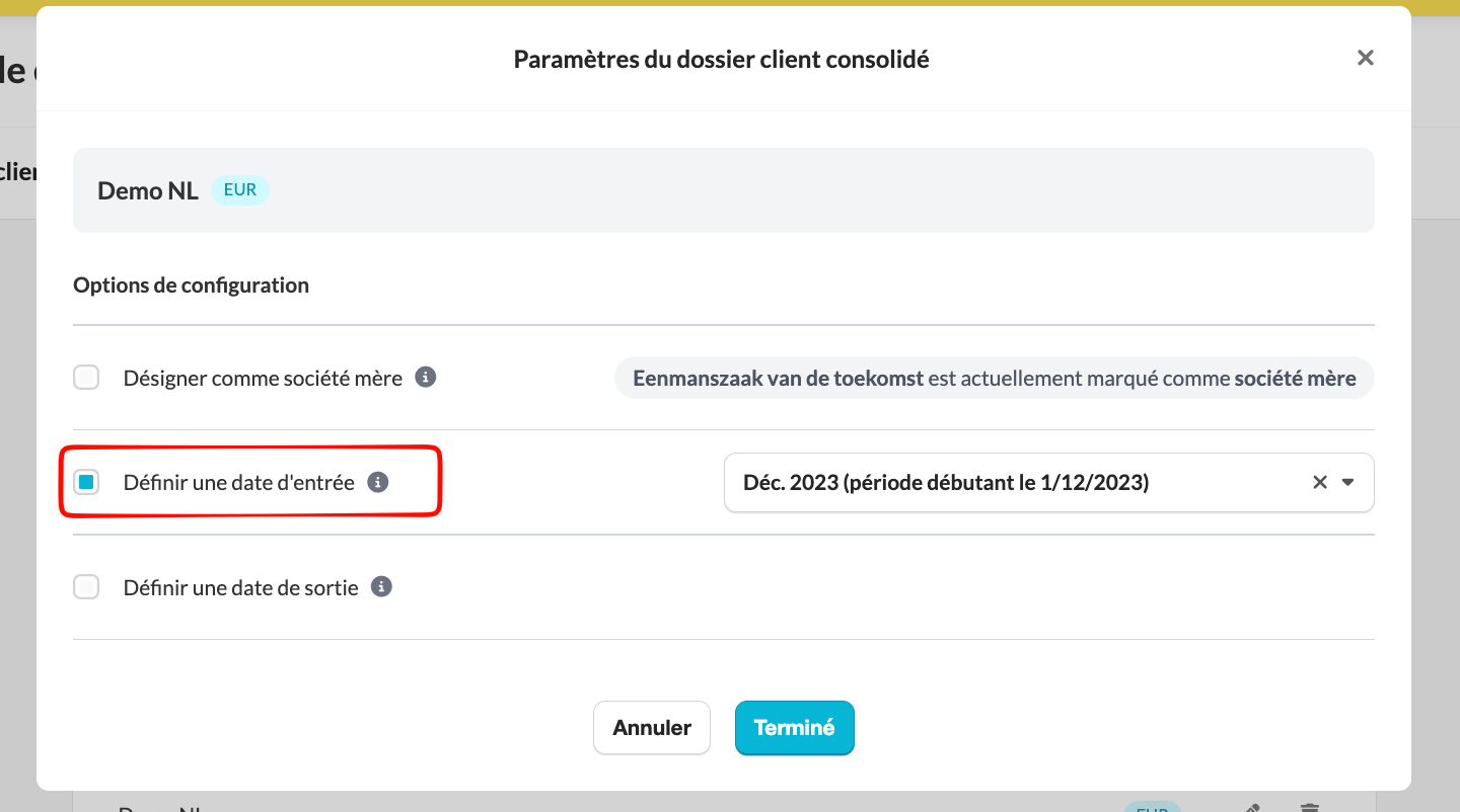 - Définir la date d'entrée ou de sortie : Vous pouvez spécifier la date à laquelle un dossier rejoint ou quitte la consolidation. Sans date, Silverfin utilise toutes les données disponibles de ce dossier.