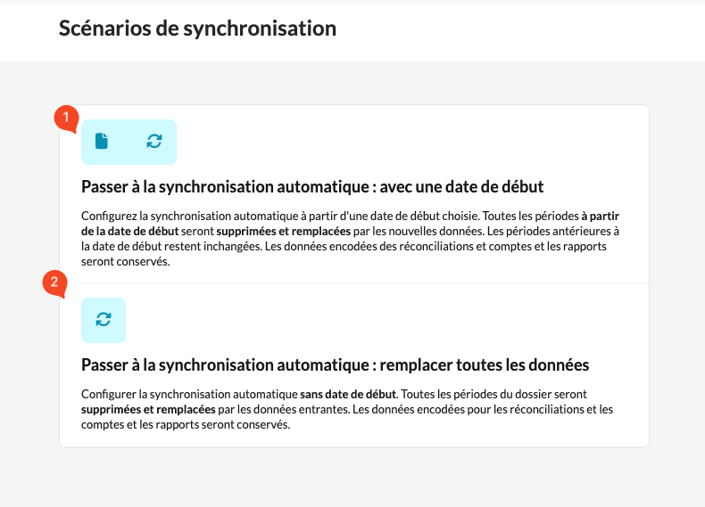 - Choisissez l'un des scénarios de synchronisation proposés. Si vous avez choisi le premier scénario, vous serez invité à définir la date de transfert de la synchronisation.
