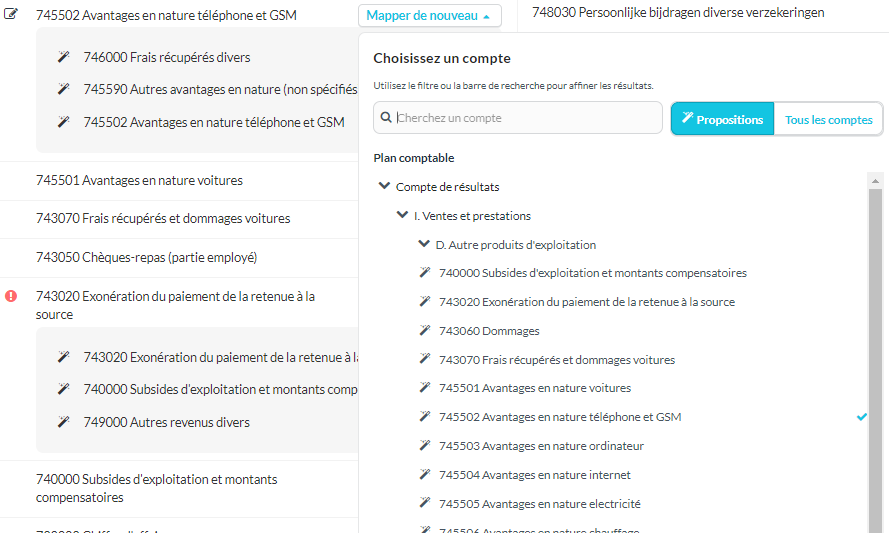 Si le compte souhaité n'apparaît pas en ligne, cliquez sur le bouton 'Mapper de nouveau' (qui apparaît en survolant une ligne) pour rechercher des comptes dans la structure du workflow du dossier. Utilisez le menu déroulant pour sélectionner parmi les propositions de l'IA ou afficher tous les comptes.