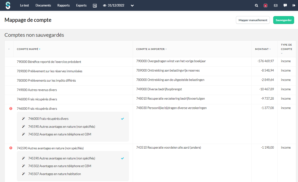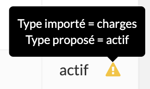 - Quatrième colonne : Affiche le type de compte du compte mappé. Une divergence avec le type de compte importé sera signalée par une icône d'avertissement. Le type de compte de la proposition sera utilisé lors de l'enregistrement.