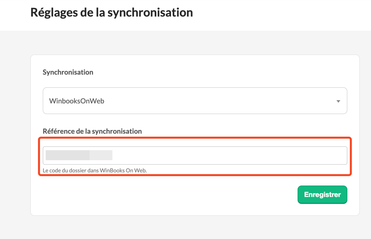 - Choisissez WinbooksOnWeb dans la liste des synchronisations. Ajoutez une référence de synchronisation. Il s’agit du code entreprise dans WinbooksOnWeb.