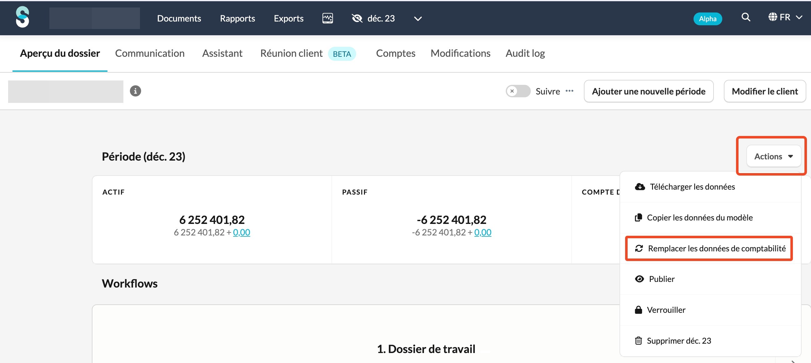 1. Ouvrez votre dossier client et cliquez sur le bouton Actions. Assurez-vous d’être dans la période où les données doivent être remplacées.