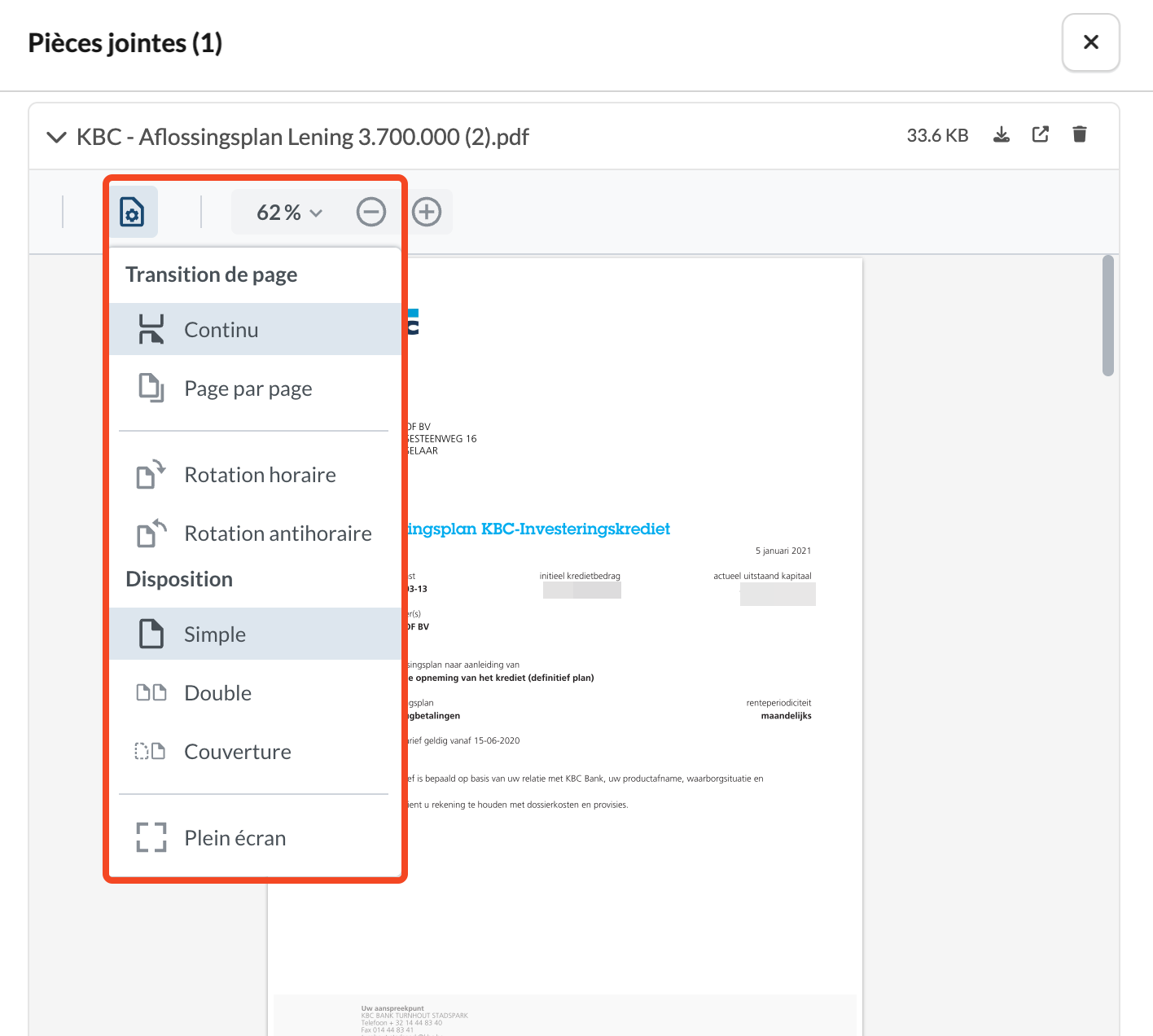 Lorsque vous cliquez sur l’icône trombone dans un modèle pour joindre un document ou ouvrir un document déjà lié, celui-ci s’affiche en écran partagé. Cela vous permet de consulter le document et de modifier le modèle en même temps, sans avoir à naviguer entre différents onglets.