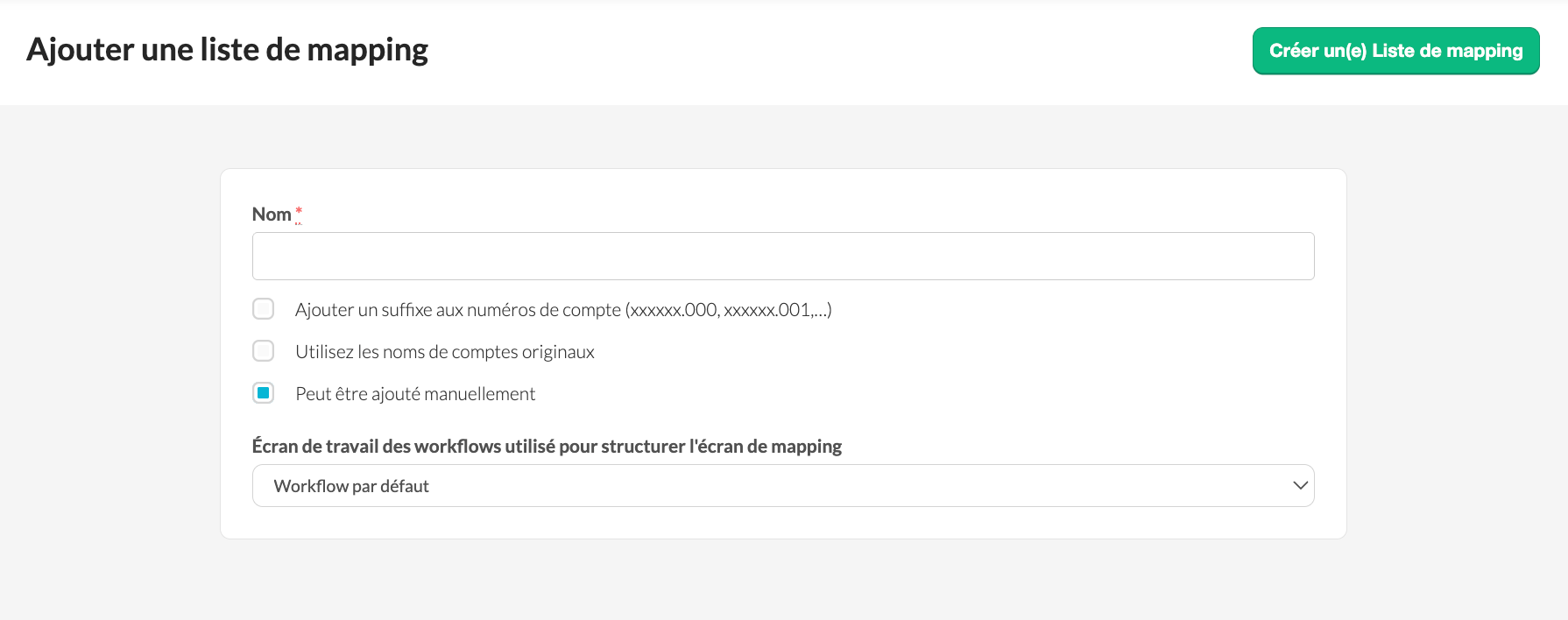 Seuls les utilisateurs administrateurs peuvent créer et gérer les listes de mapping. Les listes de mapping sont créées au niveau du cabinet (firm level).