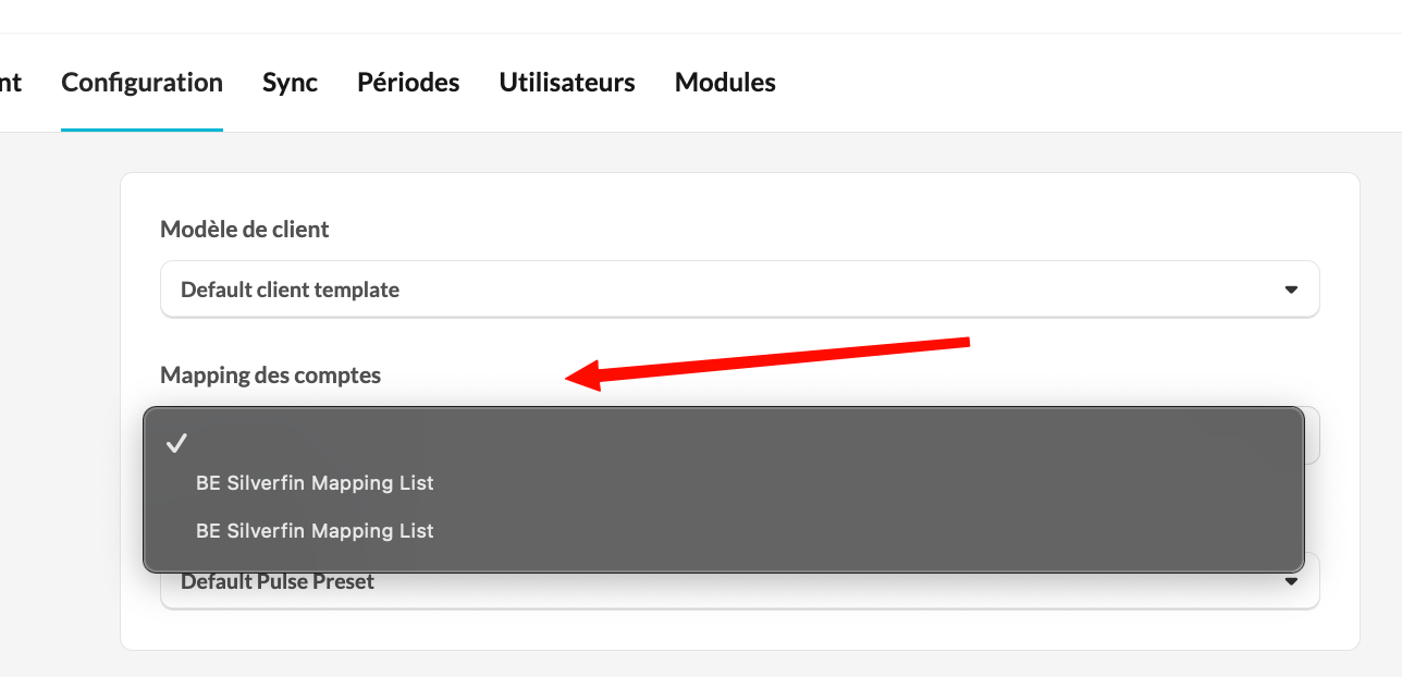 Sans l'activation des suffixes, il est impossible de mapper plusieurs comptes vers le même numéro de compte Silverfin.