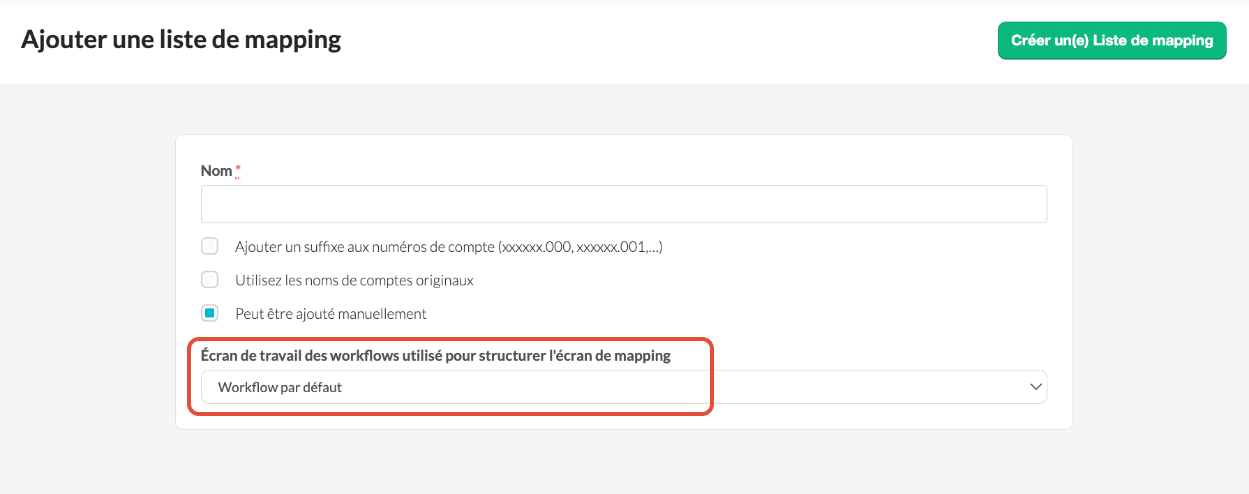 Vous pouvez choisir un écran de travail (workflow working screen) pour contrôler la mise en page de l'écran de mapping des comptes, facilitant ainsi le travail en accord avec vos flux de travail.