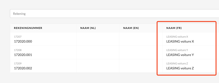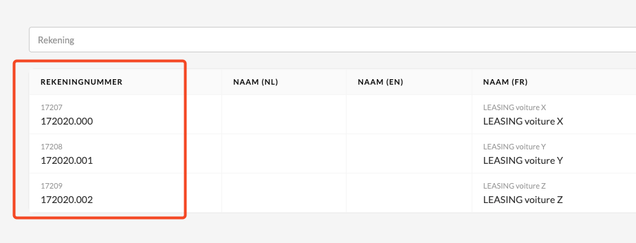 Dans le plan comptable standard de Silverfin, ces dépenses peuvent toutes appartenir à un compte unique tel que 172020 Dettes de location-financement et assimilées sur des biens mobiliers.