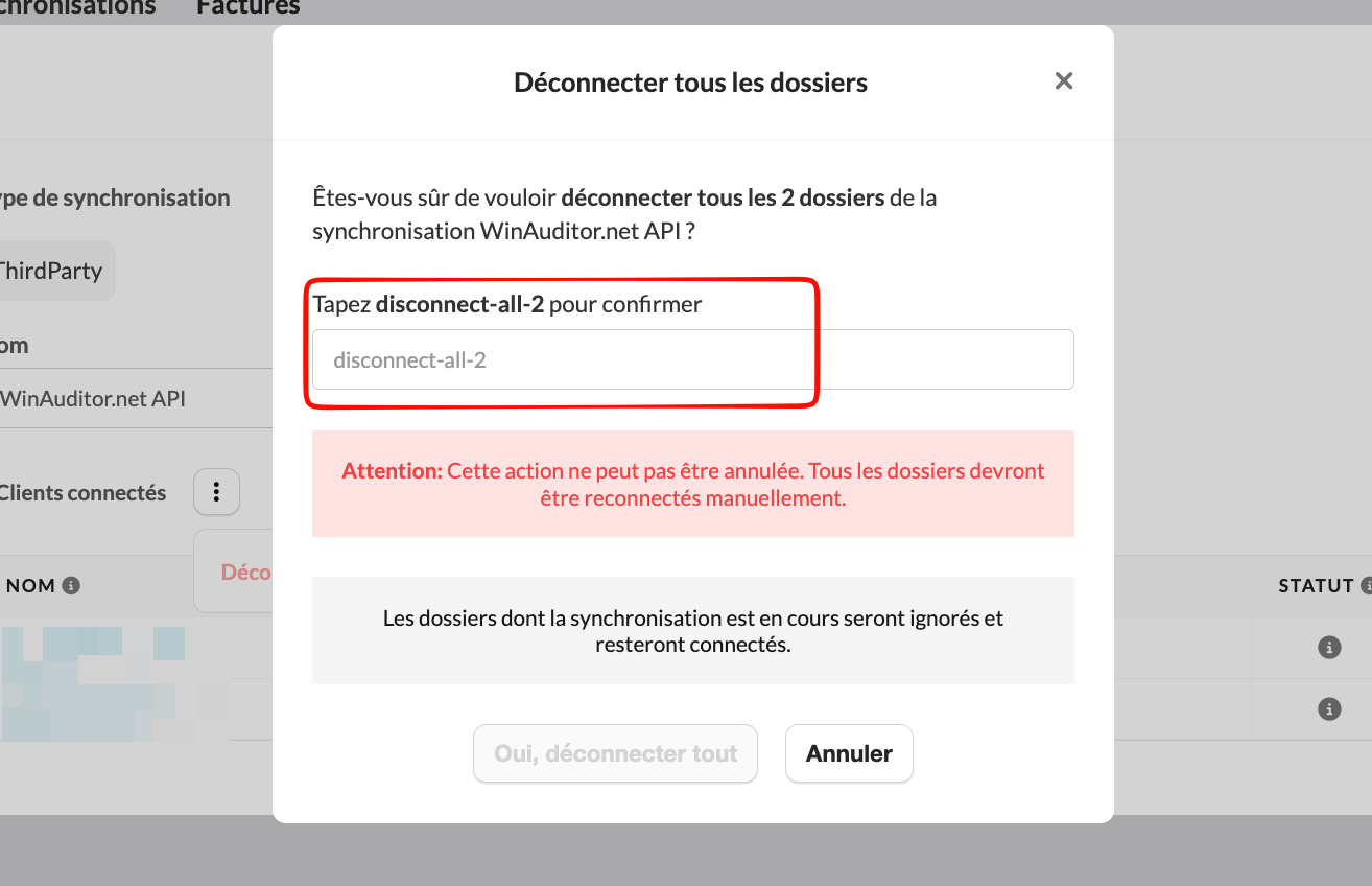 - Cette action ne peut pas être annulée. Si des dossiers sont déconnectés par erreur, ils devront être reconnectés manuellement.