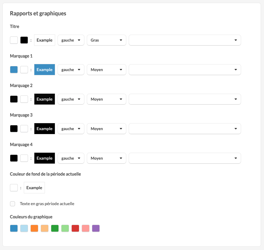 - Les couleurs des rapports sont dérivées du style d'exportation par défaut défini au niveau de bureau. Pour modifier les couleurs disponibles dans les rapports, vous devez changer les paramètres de couleur de ce style.
