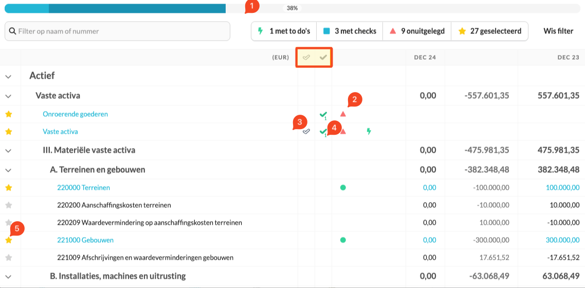 - Voortgangsbalk: De voortgangsbalk boven aan je workflowpagina laat zien hoever je bent met het voltooien van je taken. Het geeft je een percentage en een overzicht van taken, controles, afstemmingen en geselecteerde rekeningen die nog aandacht nodig hebben. Je doel is om 100% op de voortgangsbalk te bereiken, wat aangeeft dat alle taken binnen de workflow zijn voltooid.