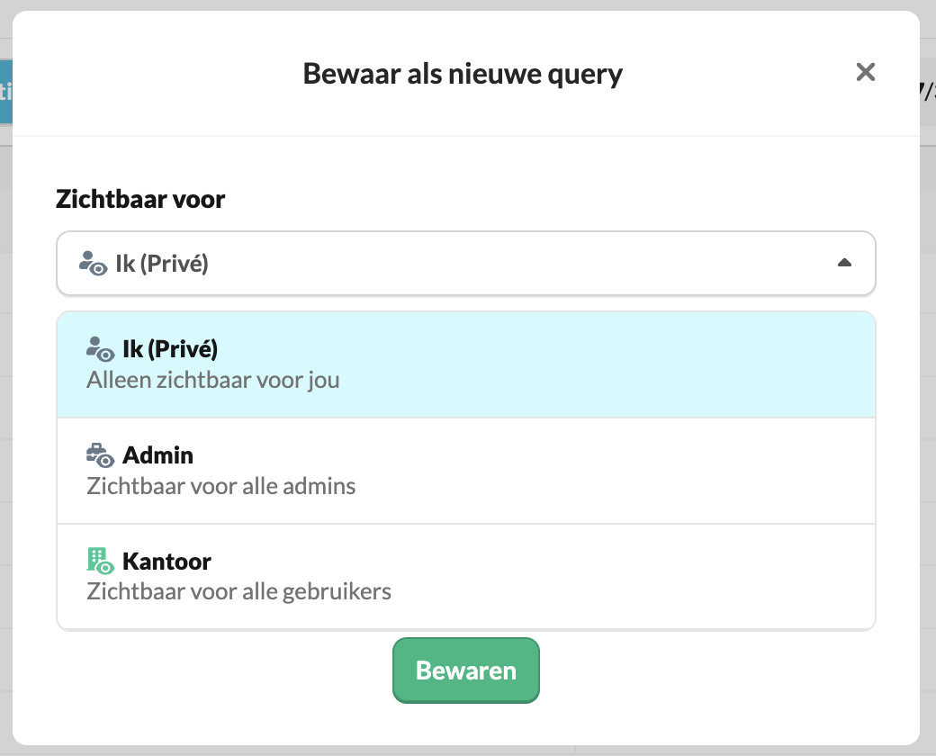 - Je kunt een bestaande query kopiëren via 'Bewaar als nieuwe query' en daar een andere zichtbaarheid aan toekennen.
